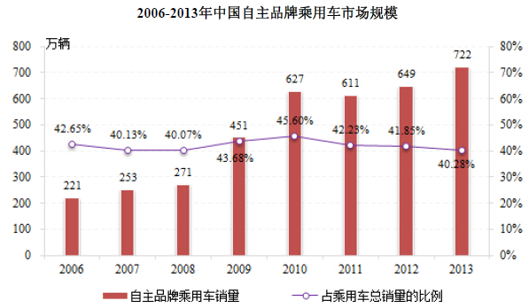 我国自主品牌乘用车市场稳步发展,销量由2006年的220.77万辆上升到2013年的722.20万辆,占乘用车总销量的比例由2006年的42.65%变为2013年的40.28%。2013年我国自主品牌乘用车销量为722.20万辆,较上年同期增长11.36%。2006-2013年中国自主品牌乘用车市场规模