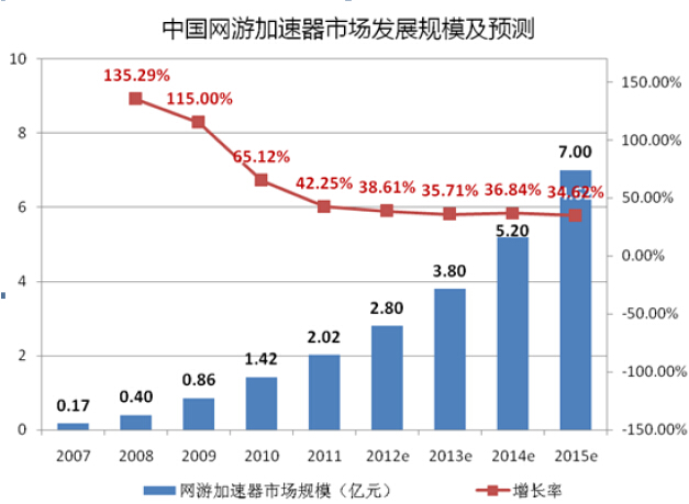 整个网游加速服务市场尚处于发展初期,而客户端网游、网页游戏、手持终端网游在细分需求上存在较大差异,因此网游加速服务提供商在现阶段多集中资源开发客户端网游这一主流市场。根据艾瑞咨询的研究资料:“2011年全年中国网游加速器市场规模将超过2亿元,2012年预计为2.8亿元,2013-2014年将分别达到3.8亿和5.2亿元,到2015年预计达到7亿元,国内网游加速市场2005年诞生至今已有6个年头,市场已经初步培育形成,目前已经进入持续增长期,预计未来几年仍将保持30-40%以上的环比增长率”。
