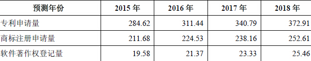 根据国家知识产权局知识产权发展研究中心的预测,截止至2018年,国内的知识产权权利数量规模预计将增长近50%,知识产权保护服务业的市场规模预计也会相应快速增长,主要知识产权登记量2015年至2018年预测情况如下:单位:万件