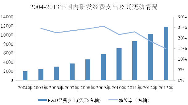 有效的投入是知识产权产出的前提保证,2004年至2013年,国内研发经费支出呈高速发展趋势,2013年已经突破10,000亿元大关,占当年GDP的2.09%,进一步接近发达国家水平。