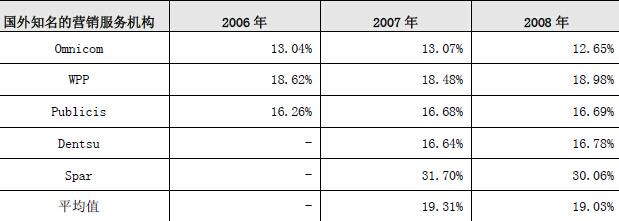 如上表所述,上述企业的平均毛利润在19%左右。在我国,由于成本构成、业务结构等方面的差异,同时我国属于新兴市场,推测我国营销服务业的利润水平在其之上。