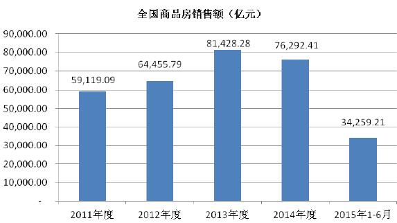 2015年1-6月,全国商品房销售额为34,259.21亿元,同比2014年1-6月31,132.81亿元增长10.04%。2011年至2014年,全国商品房销售额由59,119.09亿元增长至76,292.41亿元,复合增长率为8.87%。