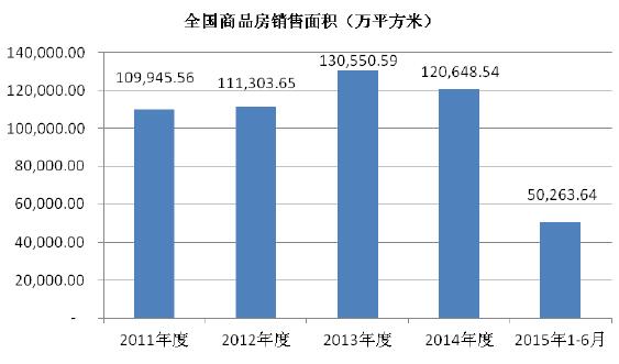 2015年1-6月,全国商品房销售面积为50,263.64万平方米,同比2014年1-6月48,365.23万平方米增长3.93%。2011年至2014年,全国商品房销售面积由109,945.56万平方米增长至120,648.54万平方米,复合增长率为3.14%。