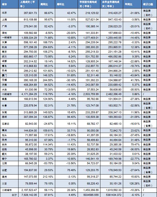 商品房成交:同比增长87.81%,环比增长4.49%,单周成交规模创15年以来次高。上周我们重点覆盖的31个大中城市商品房市场合计成交792.81万平米,同比增长87.81%,环比增长4.49%,近两年单周成交规模仅次于15年年末813.51万平米的高点水平。其中一线城市合计成交155.93万平米,同比增长71.85%,环比增长10.65%。年初至今周均成交107.75万平米,低于去年均值14.45个百分点。北京、上海延续强势走势,分别环比增长42.47%和11.00%。广州环比减少3.37%,深圳环比减少20.00%,连续三周大幅回落。二线城市合计成交417.13万平米,同比增长116.79%,环比减少4.16%,延续此前成交热情。年初至今周均成交250.38万平米,较去年平均水平增长0.86%。厦门、成都表现突出,分别环比增长51.69%和14.52%。三线城市共计成交219.75万平米,同比增长58.11%,环比增长20.36%,年初至今周均成交145.34万平米,较去年全年水平减少10.26%,改善幅度持续提升。昆明、合肥、惠州环比增速居前,分别为94.40%、75.48%、33.71%。统计局最新数据显示2016年1-2月全国商品房销售面积和销售额分别同比增长21.7%和43.6%,量价水平均得到较大幅度提升,且分化行情有所加大。近期管理层严控首付贷等民间杠杆,媒体报道深圳部分业主开始降价退出,投资性需求有所缓解。此外据媒体报道上海在酝酿更加严厉的限购政策,北京成交量经过连续上涨之后2月份房价涨幅也有所扩大,一线城市总体面临调控拐点。同时营改增细则未知,市场短期预期存在一定的不确定性。上周重点城市成交数据