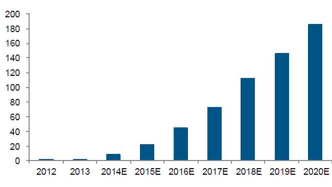 特斯拉数日内收获的订单即接近中国2015年新能源汽车总销量(33万辆),可见新能源汽车未来仍将延续高速成长的态势。据预测,到2020年新能源汽车在全球汽车份额的比例或将达到10%以上,并且汽车电子占总成本的比重将从10%上升至50%。作为新能源汽车核心器件的电容器,其需求将会随之大幅增长,国产新能源汽车用16V/500F超级电容器较便宜,售价2500元左右,48V/165F电容器售价6500左右,据推算到2020年,整个新能源车电容市场规模将快速增长并接近200亿元人民币。新能源车用电容器市场预估(亿元人民币)