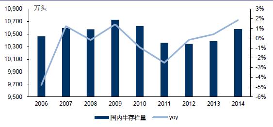 我国肉牛存栏量稳定在1.05亿头左右,增长较慢。2014年我国肉牛存栏量为1.05亿头,由于草场退化等原因存栏量增长较慢,近年来基本稳定在1.03-1.07亿头左右,按照一头牛售价1.1万元左右来估算,我国肉牛养殖市场价值在1.155万亿左右。我国肉牛存栏量增长较慢