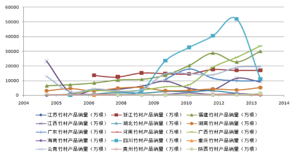 在竹制品绿色、自然、环保、生态等消费理念逐渐被市场所接纳的背景下,竹制品领域闸门迅速打开,其中在“毛竹之王”所在地江西省,竹林面积为1147.65万亩,占全国竹林总面积的26%。而江西竹种以楠竹居多,其叶色浓绿,竹干壁厚且竹材高大,得天独厚的资源优势为江西竹材加工业的发展夯实了基础。近年来江西省又通过企业整合、产业调整、科技创新、市场规范,使毛竹综合利用和深度加工得到了全面提高,随着全国竹材产品销量的高增长态势,稳占了一定的市场份额,2005年-2013年江西竹材产品销量所示: