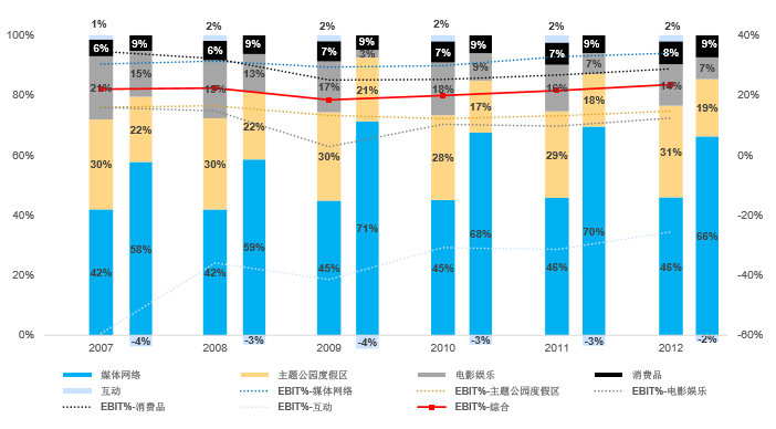 迪士尼各项业务中,电影娱乐的占比下降较为明显,其他业务的占比相对稳定;媒体网络和消费品的营运利润率在集团综合水平之上