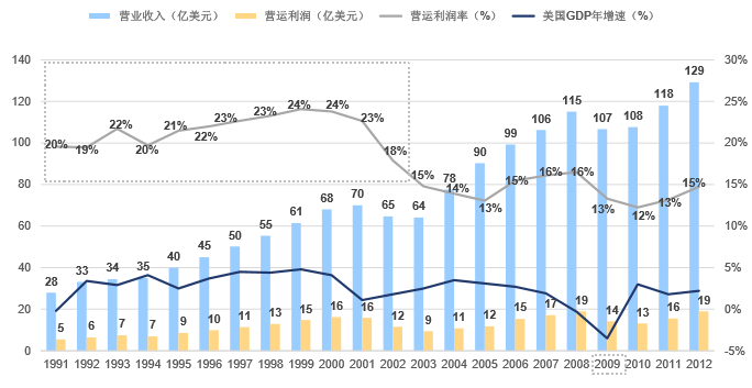 2002、2009财年经济环境低迷使得旅游业发展疲软,游客数量、游客消费、酒店入住率均受到影响,迪士尼通过门票价格调整、游乐项目扩建等方式保证整体营收趋势增长。但由于修建维护、营销、信息系统、员工福利计划等成本增加,加上欧洲迪士尼对业绩的拖累,1991~2012财年间营运利润率最高由24%降至12%