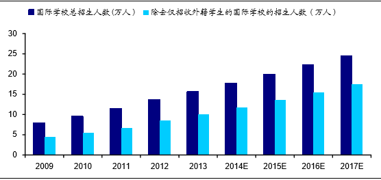 民办教育领域管制的放松以及国际教育领域政策的规范开始使得国际教育在政策上迎来发展的重要时机;外籍人员以及出国留学人群的稳步增长为国际学校带来了源源不断的生源;随着收入的提高、教育观念的转变以及社会对人才综合素质的要求,国际教育的热度将会持续发酵,国际教育将步入快速发展时期。据FrostSullivan预测,至2017年中国国际学校招收学生人数将达到24.46万人,年复合增速达11.3%。(FrostSullivan所统计的国际学校只包括外籍人员子女学校和民办国际学校,不包括公立高中国际班)