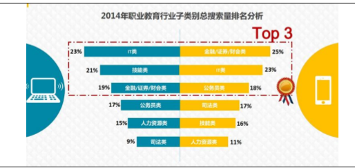 由于对行政机关单位、财务审计税务、软件互联网及IT质量管理职位的求职意向强烈且竞争激烈,金融财会、IT认证、公务员类考试及教育培训在职业教育中需求空间最大。