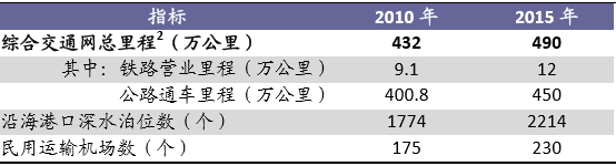 十二五‛期间,我国交通基础设施的总体目标是:‚要建设以连通县城、通达建制村的普通公路为基础,以铁路、国家高速公路为骨干,与水路、民航和管道共同组成覆盖全国的综合交通网络,发挥运输的整体优势和集约效能。‛