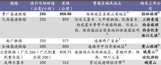 机场、铁路和海港等交通工具运输能力的提高和城市间的连通性的提升,将有效增强旅游目的地的可进入性,缩短游客在途时间,大幅提升景区长途和短途的客流量,对于旅游业发展的推动作用是非常强大的。‚十二五‛时期是我国交通基础设施网络完善的关键时期,也是构建综合交通运输体系的重要时期。2012年,国务院正式印发《‚十二五‛综合交通运输体系规划》。规划提出,‚十二五‛期间,国家要初步形成以‚五纵五横‛为主骨架的综合交通运输网络1,总里程达490万公里,至2020年我国高铁线路将贯通几乎所有的省份。