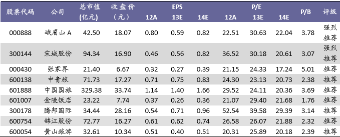 重点推荐公司中,强烈推荐峨眉山(000888)和宋城股份(300144);之后依次推荐张家界(000430)、中青旅(600138)、中国国旅(601888)、金陵饭店(601007)、腾邦国际(300178)、锦江股份(600754)和黄山旅游(600054)。