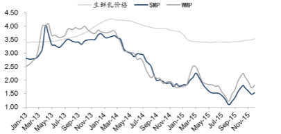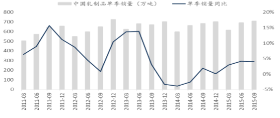 下游乳制品需求开始恢复。14年国内乳品需求不足,乳制品产量自2000年来首次下降,主要是由于:1)受中央八项规定的影响,团体采购和高端礼品奶的销售大幅下降;2)2H13国内原料奶价格暴涨,各乳企纷纷提价并提高高端产品的生产占比,对消费产生了一定的负面影响。国家统计局的数据显示,14年我国乳制品消费量为2643万吨,同比下降1.08%,而15年1-9月国内乳制品消费量为2013.5万吨,同比增长3.7%,表明我国乳制品恢复增长,这将带动对上游原奶的需求回暖。