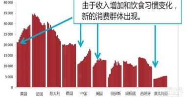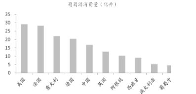国际葡萄与葡萄酒组织(OIV)发布的《世界葡萄酒市场发展与趋势报告》中显示,2013年美国首次超过法国,成为全球最大的葡萄酒消费国,中国以17亿升的消费量排名第五,在葡萄酒消费前10大国中消费量的增长速度最快。