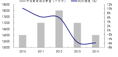 中国葡萄酒年消费量及其增速