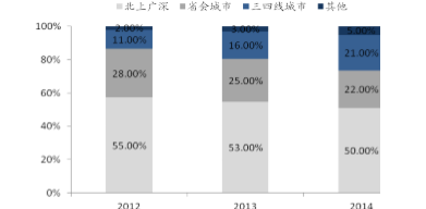 如今,但是随着收入水平提升,以及葡萄酒文化的普及,葡萄酒消费正快速向三四线城市渗透,2014年三四线城市葡萄酒消费占比已上升至21%,与省会城市消费量基本持平。