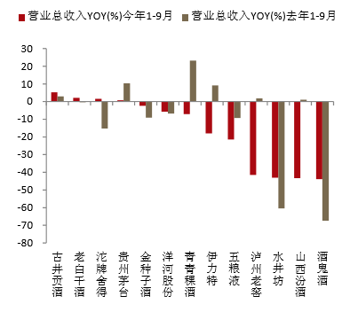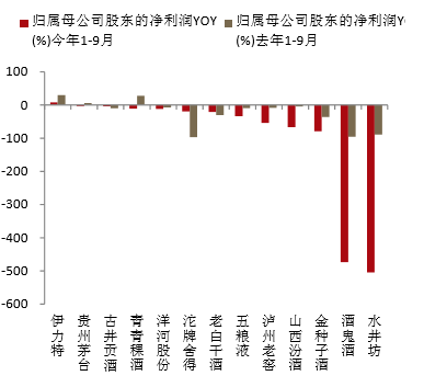 白酒行业分化加剧,拥有品牌和营销等核心竞争力的优质企业业绩确定:贵州茅台、五粮液、古井贡酒、洋河股份在行业调整中率先企稳。高端酒市场经历低点后基本面开始恢复,茅台业绩保持相对稳定,1-9月收入保持增长,五粮液业绩环比改善明显;而具有根据地市场、营销能力突出的二线龙头则保持相对稳健,古井贡酒三季度收入依旧保持了较快速度的正增长,洋河股份降幅收窄;区域强势品牌中,老白干酒,二季度环比一季度业绩大幅改善。三线白酒以次高端为主导产品的企业受冲击最为严重,水井坊和酒鬼酒1-9月净利润分别大幅下滑504.37%、473.69%