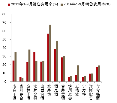 销售费用维持高位,同比继续攀升:行业调整期,各白酒企业都加大了费用的投入来抢占市场份额,2014年1-9月除了茅台和沱牌舍得销售费用率略有下降外,其他企业均加大了费用投入,侵蚀了净利润,山西汾酒、古井贡酒、金种子、老白干净利润均在15%以下。白酒企业通过加大费用投入来巩固市场份额,为利润提升提供了较大的弹性空间。