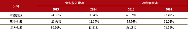 2013和2014年植物蛋白行业上市公司前三季度收入和净利润增长情况对比