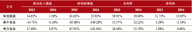 2013和2014年植物蛋白行业上市公司第三季度收入、净利润增速和盈利能力对比