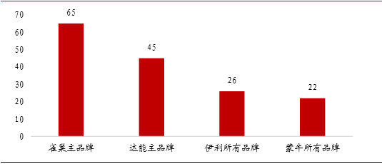 近年来伴随我国人均收入的提高和人们对健康营养食品的需求,下游乳制品企业积极进行产品升级,伊利和蒙牛已研发出多种新品并在市场上推广,如常温酸奶、植物蛋白饮料等。目前两者旗下分别有26和22类产品,包括以伊利或蒙牛品牌冠名的产品以及尚未普及的新品牌。然而,与雀巢的65个主品牌和超过2000个子品牌以及达能的45个主品牌和众多子品牌相比,伊利和蒙牛能称之为主品牌的数量较少,在提高产品品类的同时,也可积极增加旗下品牌数量,向多元化健康产品提供者的方向迈进。