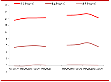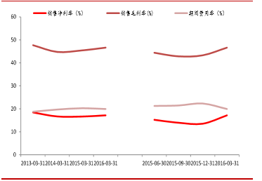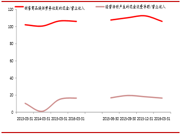 销售毛利率同比提升明显,期间费用率基本保持稳定:研究报告2016年第一季度食品饮料板块的整体毛利率为46.63%,同比提高1.23%,环比大幅提升了3.34个百分点。在通胀预期的背景下,食品饮料的盈利能力改善明显。食品饮料板块的费用率投放相对平稳,16Q1板块的期间费用率为19.93%,同比小幅下滑0.32%,其中销售费用率为14.29%,同比上升0.08%;管理费用率为5.61%,同比下滑0.29%;财务费用率为0.03%,同比下滑0.11%。板块的现金流情况稳定,经营活动产生的现金流量净额占营业收入的比重为16.54%,同比提高了1.57个百分点;收现比达到106.09%,同比小幅下滑0.48%。
