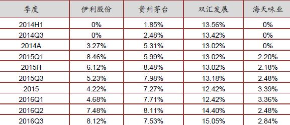 三季度基金持仓比例有所回调,行业前十大重点股持仓1.81%,仍以茅台、伊利、五粮液和老窖为主,五粮液持仓大幅下降,股价上表现出来调整幅度较大,当前持仓多以中长线为主。当前持仓比例看仍处于较低位置,持股基金个数相比二季度下降。机构持仓仍处低位