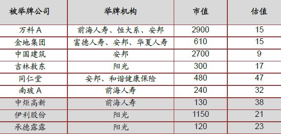 保险资金持续进入低估值品种,置换出大量价值型资金,增加长线资金比例,提升行业整体估值。从2015年开始,保险资金和产业资本不断举牌上市公司达到250次,主要集中在商贸零售、地产、建筑工程、食品饮料、公共事业、金融等低估值高分红行业,仅安邦保险持股市值超过1600亿,前海人寿15年新增持股超过300亿,16年新增超过200亿。食品饮料板块中,前海已经成为中炬高新第一大股东,并参与定增,今年下半年开始公司层面也发生积极的变化,阳光持股露露超过7.8%,持股伊利5%。保险资金当前弹药充足,开始为争夺控制权不断增持,并对企业进行价值重估,但能够取得控制权的企业毕竟少数,更多资金开始转向低估值稳定收益的品种进行配置,中为咨询认为保险举牌持续彰显资产荒下消费类股票的价值,被置换出的资金大多也是中长线价值型资金,整体提升了价值股的估值水平。部分保险举牌公司及估值