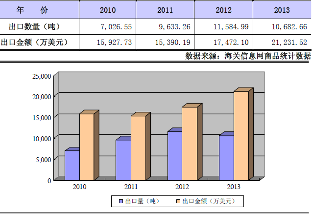 根据中国海关信息网商品统计数据,2010 年以来中国松籽仁产品出口数量由2010 年的7,026.55 吨上升到2013 年度的10,682.66 吨,出口销售金额由2010 年的15,927.73 万美元上升到2013 年度的21,231.52 万美元。呈现较好的增长趋势。