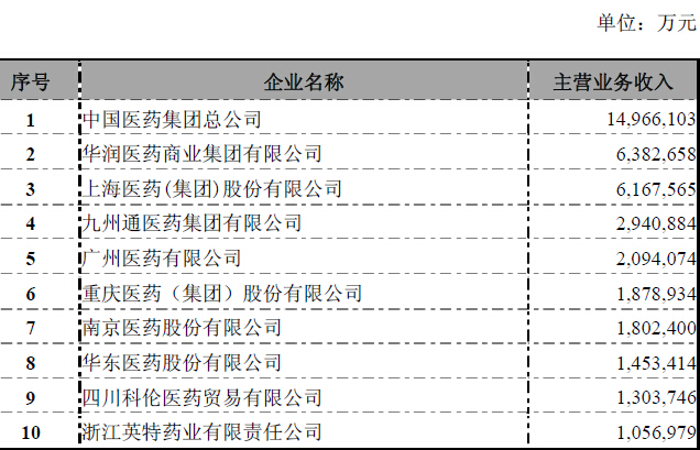 2012年度全国医药批发企业主营业务收入前10位如下: