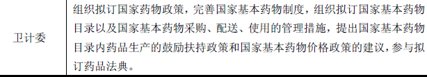 我国医药行业的主管部门主要为国家药监总局、商务部等,同时,国家发改委、卫计委等部门共同对医药行业进行监督和管理。各部门的主要职责如下: