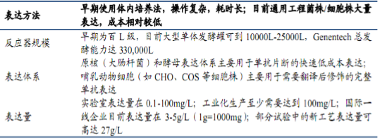 (2)表达培养技术:方法、规模、体系和表达量是四要素作为单抗研发生产链条中承上启下的一环,表达培养技术是单抗产量形成和质量控制的关键,而判断企业这方面技术水平高低的指标主要有表达方法、反应器规模、表达体系和表达量这四要素。