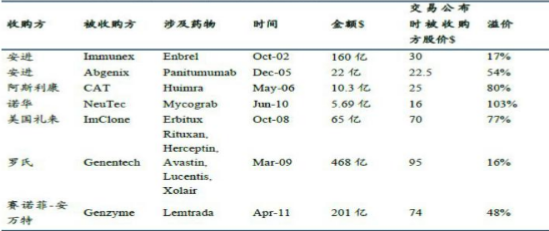 的早期,BigPharma(大型综合医药企业)无论在技术储备还是研发人员上均不存在垄断性优势,质地优良的中小型企业能够通过单个或几个拳头产品迅速成长,并在之后多年保持其优势。但随着单抗产业规模日益扩大,特别是重磅炸弹的不断涌现,BigPharma越发意识单抗领域的巨大潜在市场价值,于是它们开始凭借资金优势收购那些研发能力强、拥有明星药物的中小企业,借此获得行业领导地位,而这种趋势在2002年后更加明显。