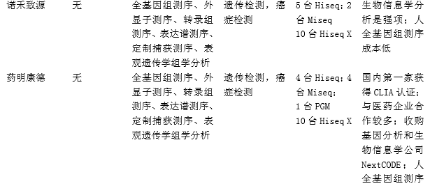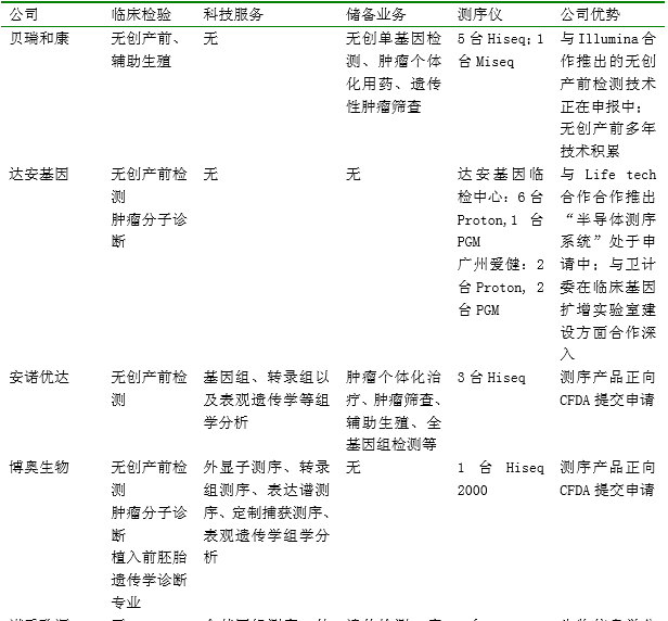 国内主流二代测序服务公司的业务,可以划分为临床检验业务,科技服务业务和储备业务。各个公司之间目前提供的业务同质性越来越大,各个公司开展的科技服务基本是根据购买的测序仪的测序能力来进行的。对于科技服务,拥有较高的测序准确率以及较好的操作技术的企业会更受亲睐;而在临床检验上拥有医院资源的企业则可以通过医院入口抢占更多的病人样本资源。在无创产前检测领域国内华大基因和贝瑞和康是两大巨头,随着国家临床诊断试点的颁布,在测序服务的各个领域先获得CFDA批准的公司拥有先发优势。