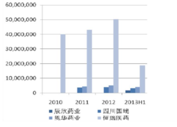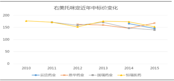 右美托咪定为恒瑞医药首仿,2010年进入市场,此后每年都会有新的生产企业加入竞争。目前一共有四家生产企业,分别是恒瑞、国瑞、恩华和辰欣。四者在价格上没有区分度,预计未来将有激烈的竞争。