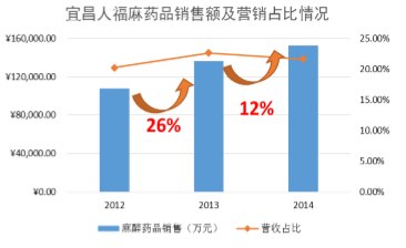 人福医药2014年营业收入达到70亿元,较上年同期增长17.33%,高于医药行业平均增速。其中麻醉药品销售收入为15.3亿元,占营业收入的比重为21.68%。从近年数据可以看出,麻醉药销售收入在人福医药总营收中占据1/5以上位臵。不过从这两年增长情况来看,14年增长率仅有12%,明显放缓。