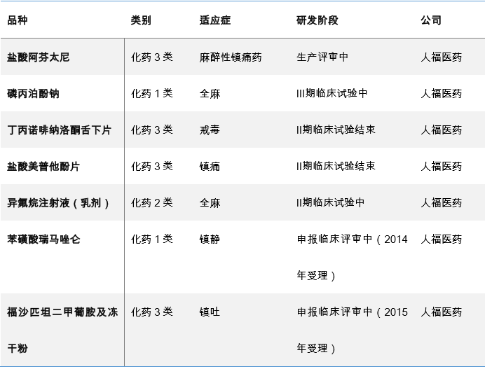 人福医药麻醉药物的研发和生产销售工作主要由宜昌人福承担,宜昌人福是国家麻醉药品定点研发生产企业、其麻醉系列新药产业化项目已被国家发改委列入国家高技术产业化示范工程。该公司生产经营200多个品种品规的制剂及原料药,包括枸橼酸芬太尼原料及制剂、国家二类新药盐酸瑞芬太尼原料及制剂、国家三类新药枸橼酸舒芬太尼原料及制剂和二类精神药品咪达唑仑原料及制剂。