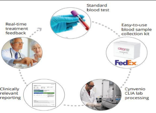 展示的CYNVENIO对血液样品的处理流程,第一步是标准的血液样本处理,第二步通过使用ClearID在LiquidBiopsy仪器上富集纯化罕见细胞,然后第三步在其通过CLIA验证的实验室进行下游的测序分析,最后两步则是得到分析报告从而反馈给医生。