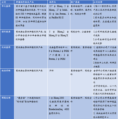 目前国内还有规模比较大的基因测序服务公司如诺禾致源、达安基因、迪安诊断都还没有成熟的肿瘤测序产品正式推出,这些企业在该测序服务细分领域都已经涉足。