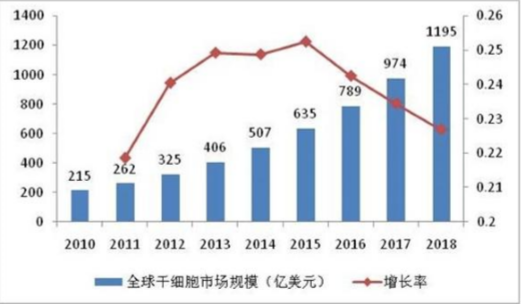 近年来干细胞研究及应用已成为衡量一个国家生命科学与医学发展的重要指标,许多国家对干细胞研究大力支持。据国际研究机构MarketResearch.com及TransparencyMarketResearch的数据显示,2010年全球干细胞市场规模约为215亿美元,2014年已达500亿美元,预计2018年全球干细胞医疗市场将超千亿美元。