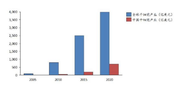 据干细胞行业报告《StemCellResearchMarketto2017-GBIResearch2011》,干细胞规模每年平均以34%复合增长率增长,预计未来20年内,干细胞全球市场规模有望达到4000亿美元。