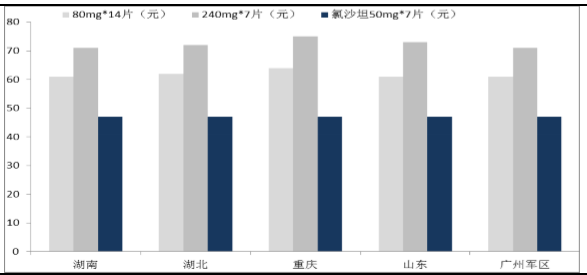 目前,阿利沙坦酯片已经在湖南,湖北,重庆,山东以及广州军区等五个区域中标,并同时在多个省份有序进行招标工作。现在多是以备案价格进行销售,即价格维持在60-70元/盒的范围波动。与科素亚(50mg*7片)最高零售价(47元/盒)相比较,价格空间更大,是目前为已经中标抗高血压产品当中,最具有竞争优势的价格。我们判断2015年下年中标区域将会增加5个,总共达到10余个省份中标。根据国家对创新药的鼓励政策和招标情况,有望在2015年底进入国家医保目录。