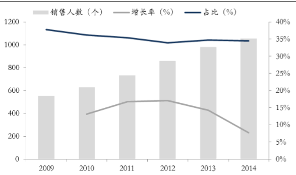 信立泰公司销售队伍,基本每年以100人左右的规模递增,2014年销售人员为1054人,增速有所放缓;同时,销售队伍稳定,销售人员占比维持在公司总人数的1/3强。