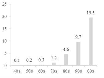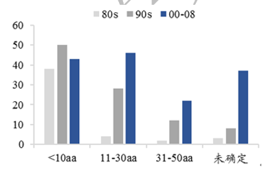 90年代,多肽合成技术日渐成熟,多肽合成成本大大下降,是多肽药物的研究重新成为热点。大型制药公司纷纷加入多肽药物研发的行列中,一方面进入临床试验的多肽药物数量由较大增长,同时长多肽的占比也有所提高。90年代进入临床研究的多肽药物中,长度大于10个氨基酸的多肽药物有20多个,长度大于30个氨基酸的多肽也超过了10个;至2000年以后,长多肽分子的比例进一步增加。