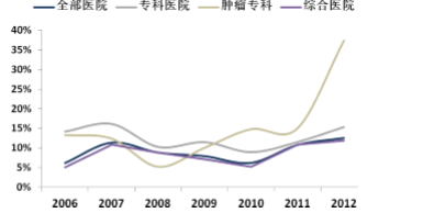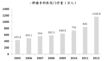 2006-2012年,肿瘤医院门诊量保持快速增长,复合增速超过医院整体,也超过综合医院及专科医院。