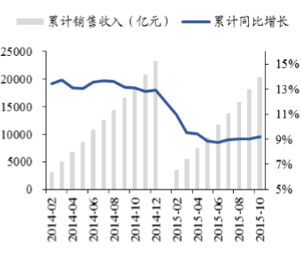 受宏观经济变化、药价改革、成本等因素影响,2015年1~10月我国医药制造业共实现销售收入20379.97亿元,同比增长9.18%,增速比去年同期下滑3.94个百分点。今年1~10月累计完成利润总额2039.42亿元,同比增长13.75%,增速较去年同期略有回升。与之前的收入和利润增速相比,行业增长仍处于“低通道”之中,尤其是收入增长已跌至两位数以下。