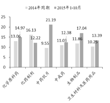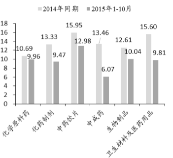 从医药产业的不同子行业来看,2015年1~10月各子行业的累计产品销售收入与2014年同期相比,增速均出现不同程度下滑。其中,中成药、卫生材料与医疗用品和化药制剂的产品销售收入下滑较为明显,较去年同期增速分别下降7.39、5.79和3.86个百分点。我们判断,在招标限价、限抗、限制辅助用药等压力下,化药制剂的销售收入和利润增速双双下降,中成药在销售收入大幅下降的同时,由于本身毛利较高,利润增速小幅增长。只有中药饮片实现了利润增速的大幅增加。