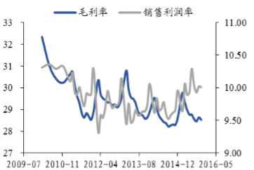 医药工业的毛利率从2010年开始在波动中逐渐下降,2015年1~10月,医药工业毛利率为28.53%,同比反弹0.22个百分点。2015年1~10月,销售利润率为10.01%,利润率总体上呈下降趋势,今年下半年有部分反弹。